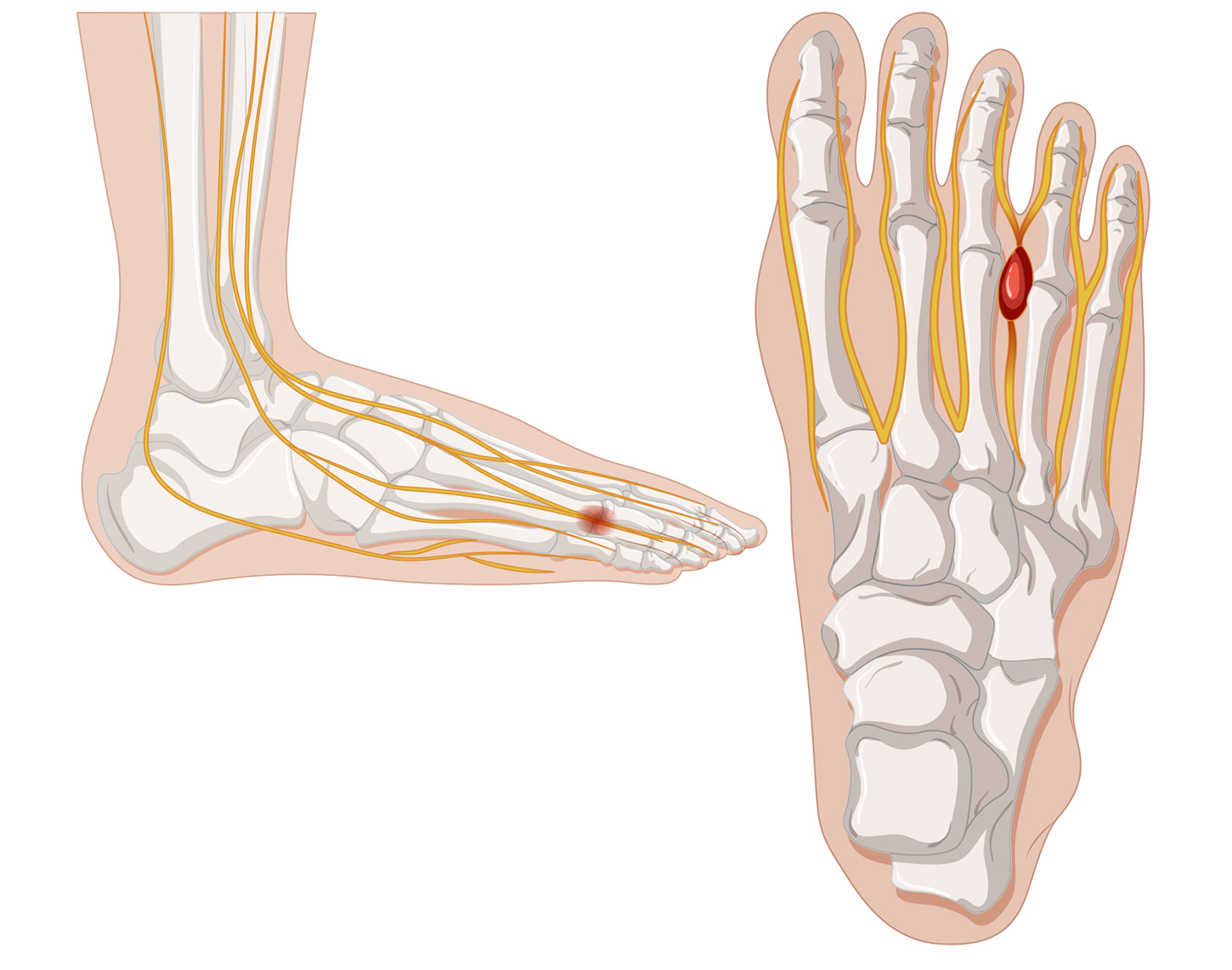 Een Morton’s neuroom is een beknelling van een gevoelszenuw die tussen de tenen loopt meestal tussen de derde en vierde teen. Door langdurige druk of wrijving raakt de zenuw geïrriteerd en verdikt. Die verdikte zenuw zorgt vervolgens voor extra druk bij elke stap die je zet. Het gevolg? Een zeurende, branderige of tintelende pijn onder de voorvoet, die kan uitstralen naar de tenen. Soms voelt het alsof je op een knobbeltje loopt, of alsof de tenen even “vastplakken” aan elkaar.
